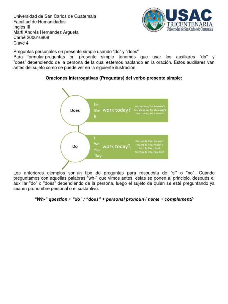 Hasta ahora, las preguntas van en segunda persona, y las respuestas en. Cabe estacar que sus auxiliares son el do (i, you, they, we) y el does (she, he ,it). Comienza las frases con mayúscula. Los verbos do y does tienen varios usos: