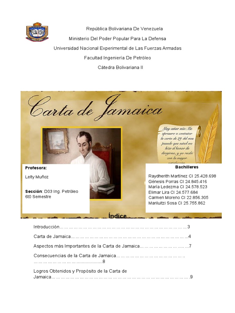 La carta de jamaica es un texto escrito por simón bolívar el 6 de septiembre de 1815 en kingston, en respuesta a una misiva de henry cullen donde condensa el que habría de ser el programa político y estratégico de la acción libertadora de simón bolívar, es una misiva redactada con el. Quora es un lugar para obtener y compartir conocimientos. ¿cuenta la dirección en la carta del dele c1? 1) la carta de jamaica es un texto escrito por simón bolívar el 6 de septiembre de 1815 en kingston, en respuesta a una misiva de henry cullen donde nuevas preguntas de historia.